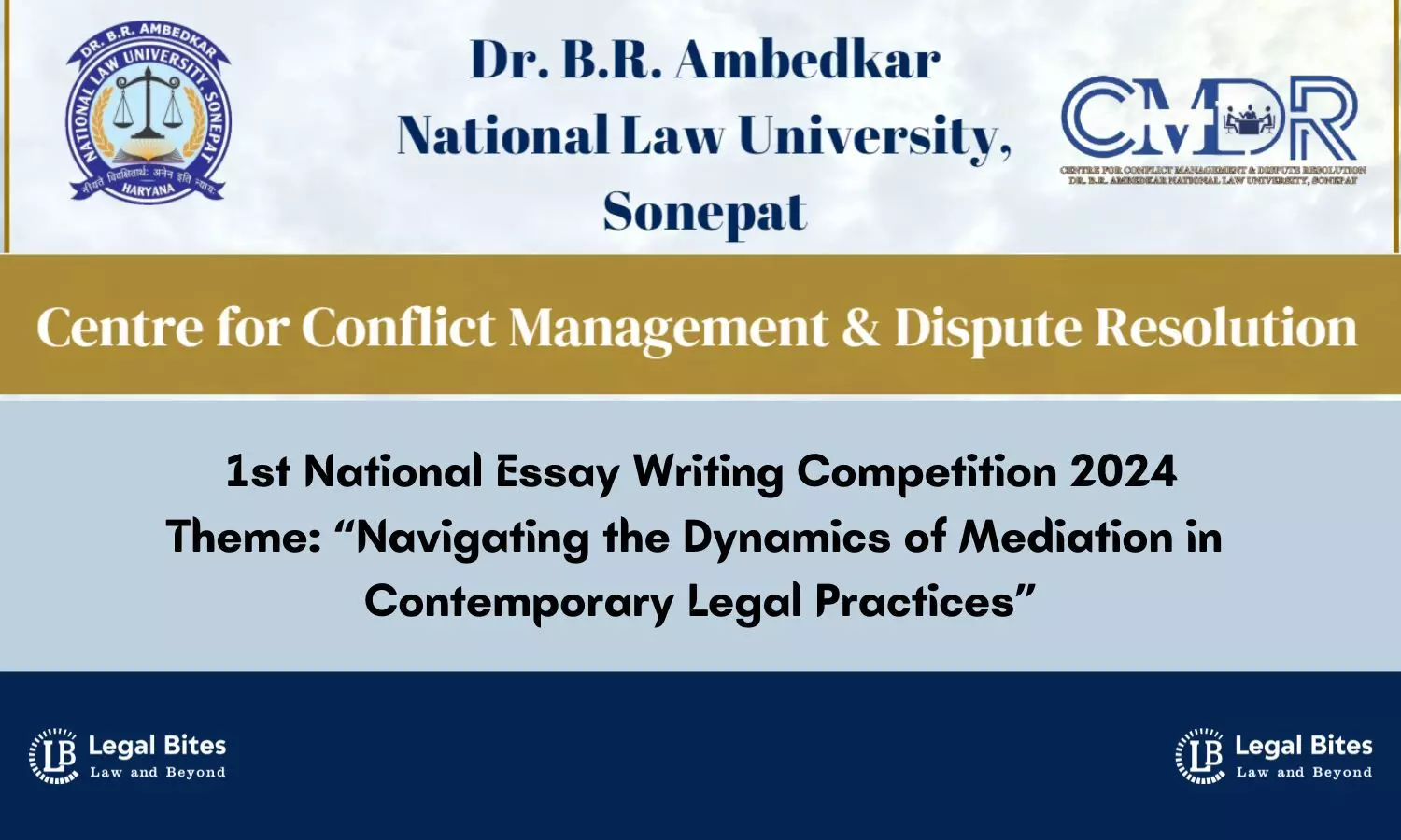 1st National Essay Writing Competition by Centre for Conflict Management & Dispute Resolution of Dr. B.R. Ambedkar National Law University, Sonepat on theme of “Navigating the Dynamics of Mediation in Contemporary Legal Practices”.