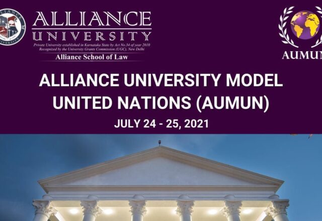 Alliance School of Law, Bangalore is organizing its first online edition of Alliance University Model United Nations (AUMUN) on 24th and 25th July 2021. The aim of organizing AUMUN is to facilitate meaningful debate on international issues by inculcating the quintessential skills of critical thinking, research and eloquence in all participants. AUMUN presents an enriching