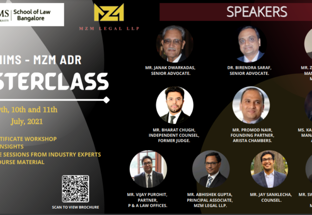 Narsee Monjee Institute of Management Studies (NMIMS), School of Law, Bangalore is proud to announce “NMIMS MZM ADR MASTERCLASS” on “ALTERNATIVE DISPUTE RESOLUTION” in association with “MZM LEGAL LLP” on 9th, 10th and 11th July 2021. This national workshop will be 3 days event divided into 10 sessions which will take us into a more