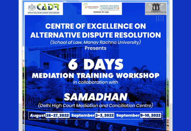 Last Updated on 55 mins by Admin LB Centre of Excellence on Alternative Dispute Resolution, School of Law, Manav Rachna University presents a 6 Day Mediation Training Program in collaboration with Samadhan (Delhi High Court Mediation and Conciliation Centre) in August-September 2022. About Manav Rachna University Manav Rachna University (MRU) is a State Private University