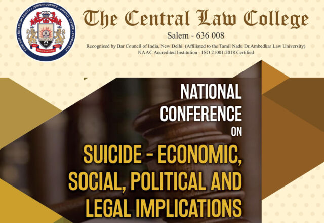 One Day National Conference on Suicide – Economic, Social, Political & Legal Implications is being organised on 25 Feb 2023 by The Central Law College, Salem. About the College The Central Law College, Salem is recognized by The Bar Council of India, New Delhi and originally affiliated to University of Madras and later with The