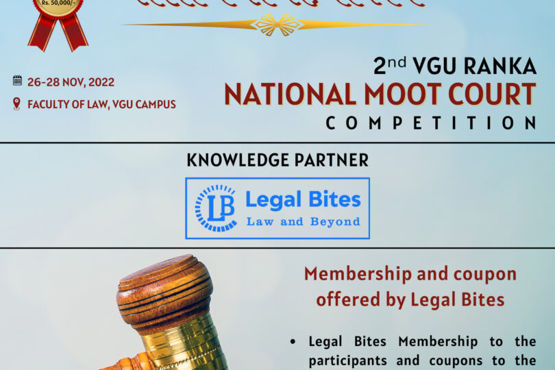 Faculty of Law, VGU in association with Ranka Public Charitable Trust in it’s dedicated efforts towards growth and development of legal fraternity takes immense pride to announce it’s 2ⁿᵈ VGU Ranka National Moot Court Competition, 2022 scheduled to be held in offline mode from 26ᵗʰ-28ᵗʰ November, 2022. In this regard, we solicit your cooperation by taking part in the National Moot Court Competition.