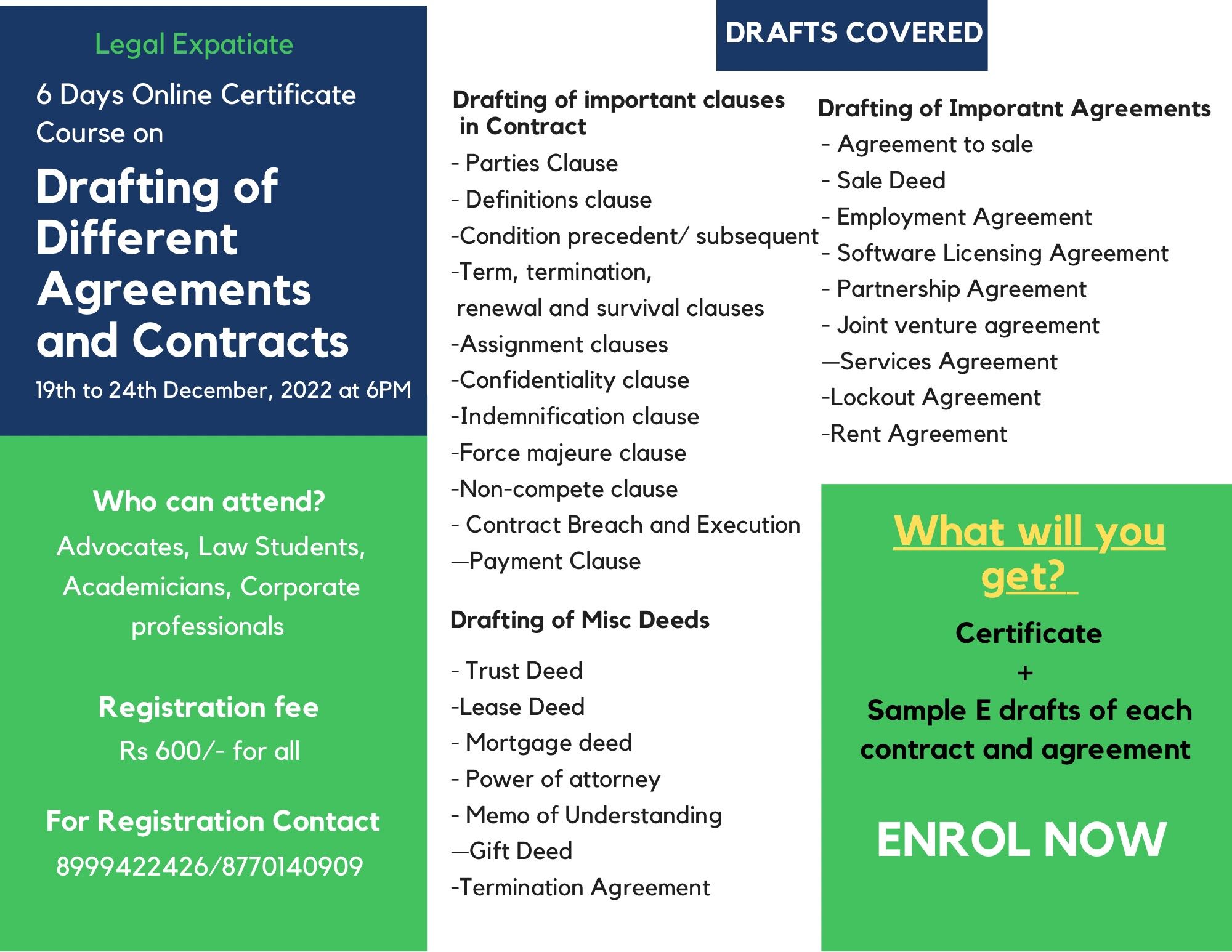 Legal Expatiate is organising 6 Days Online Workshop on Drafting of Agreements And Contracts from 19th to 24th December, 2022. Only limited seats are available.