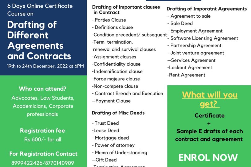 Legal Expatiate is organising 6 Days Online Workshop on Drafting of Agreements And Contracts from 19th to 24th December, 2022. Only limited seats are available.