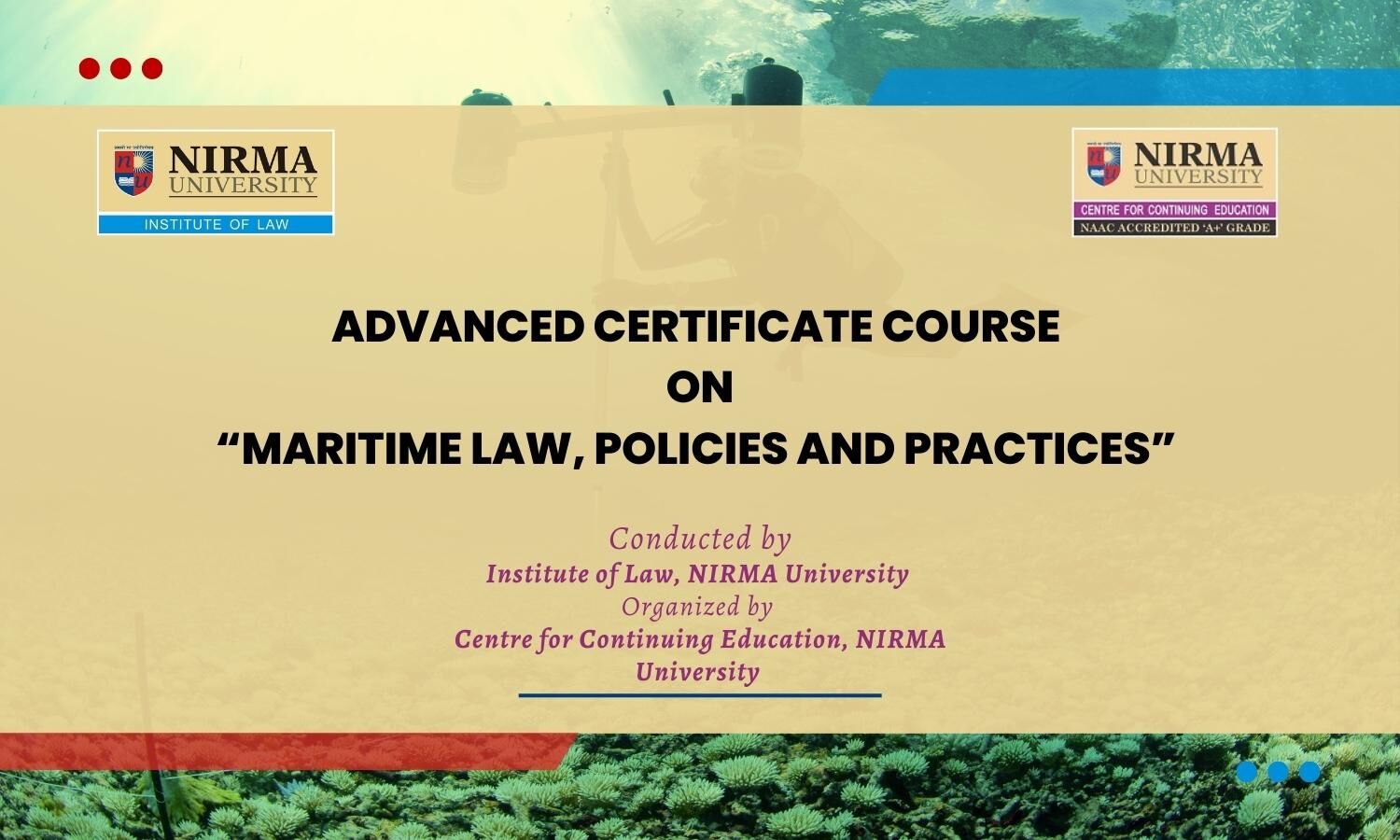 Institute of Law, Nirma University under the aegis of Centre for Continuing Education, Nirma University is organising an Advanced Certificate Course on “Maritime Law, Policies and Practices“. The course is designed for Undergraduate, Postgraduate students, Researchers, Scholars, Maritime Ports Officers, Seafarers, Maritime Professionals, Academicians of the related field and various other stakeholders.