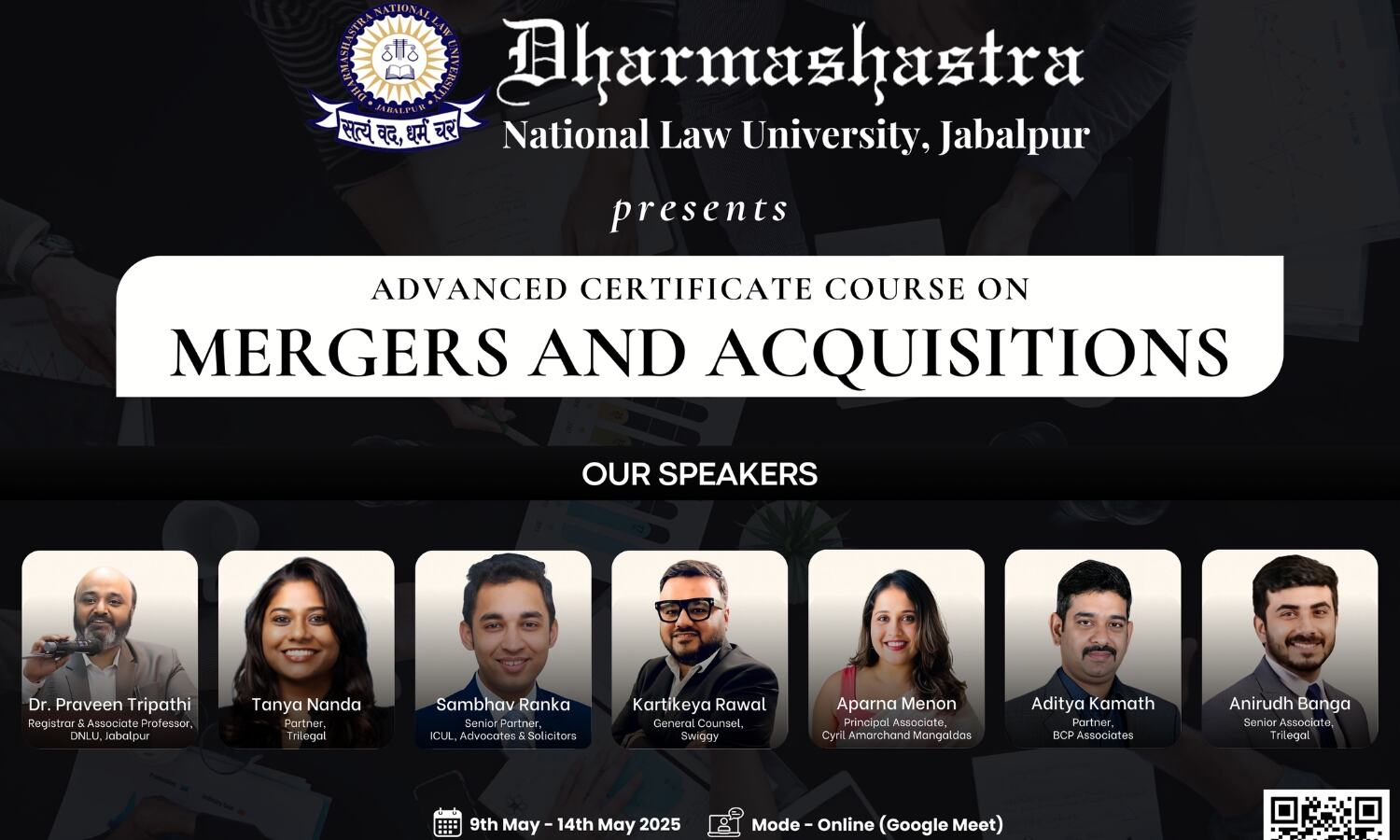 Dharmashastra National Law University (DNLU), Jabalpur is organising an Advanced Certificate Course on Mergers and Acquisitions. This course equips you with the knowledge and practical skills to thrive in the dynamic world of M&A.