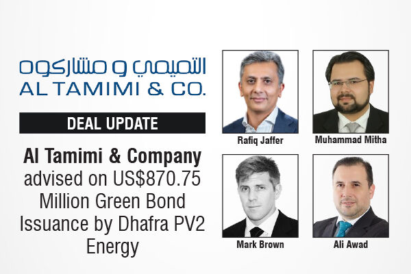 The Al Tamimi & Company deal team was jointly led by Rafiq Jaffer (Partner) and Muhammad Mitha from the Debt Capital Markets practice, along with Mark Brown (Partner) and Marianna Margaritidou (Associate) from the Banking & Finance – Project Finance team.