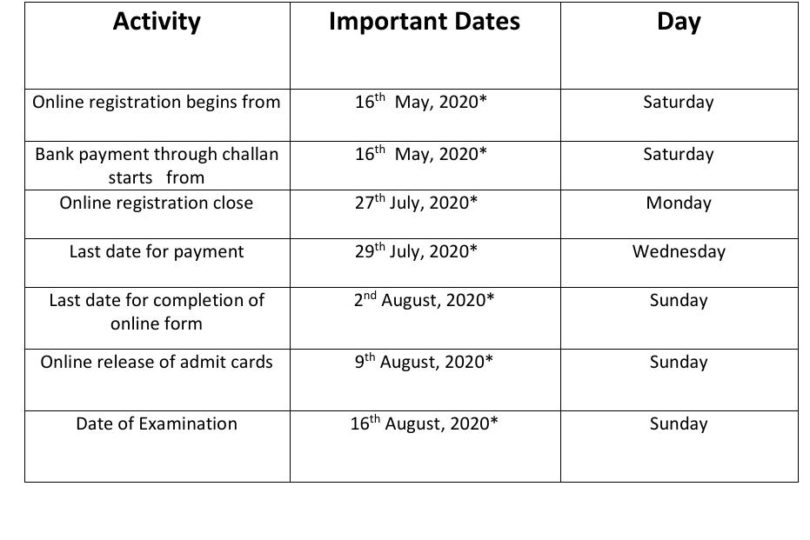 Online registration is due to begin from 16 May 2020 until 27 July 2020, with admit cards to be released on 9 August.