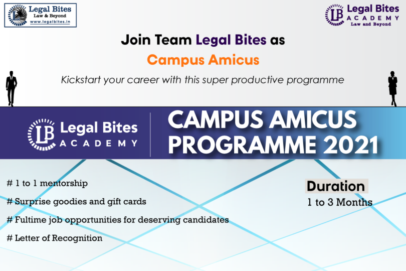 Legal Bites is excited to announce the launching of Campus Amicus Programme 2021 to widen our reach among young law students studying in various colleges and universities across India. This programme aims at promoting our presence and developing a nation-wide network to create a student-mentor nexus between the college students and Legal Bites.