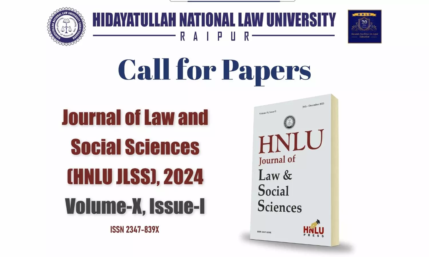 Hidayatullah National Law University, Raipur invites submissions for its forthcoming Journal of Law and Social Sciences HNLU JLSS Vol X, Issue I.