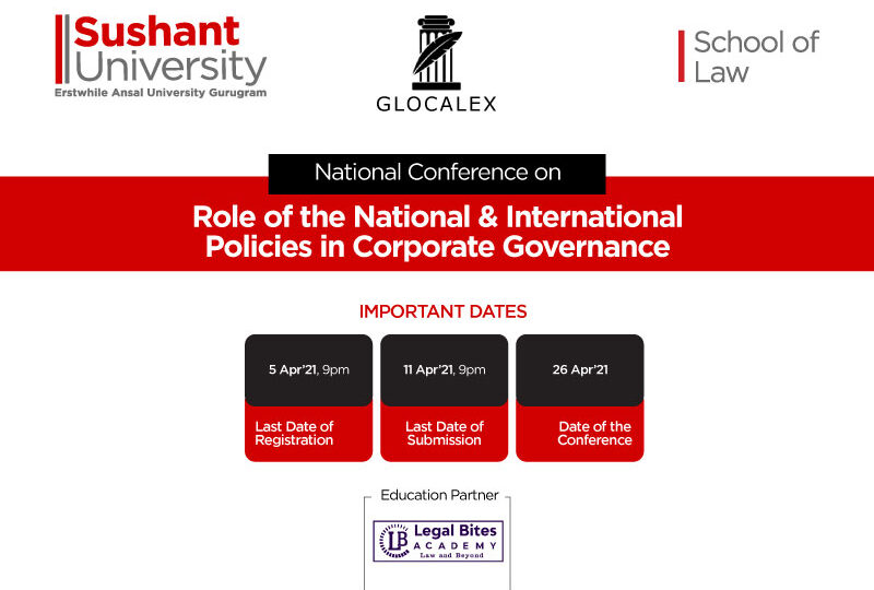 CCLRT (Centre for Corporate Legal Research and Training), School of Law, Sushant University is organizing Conference on Role of National and International Policies in Corporate Governance in collaboration with Glocalex on 26th April 2021.