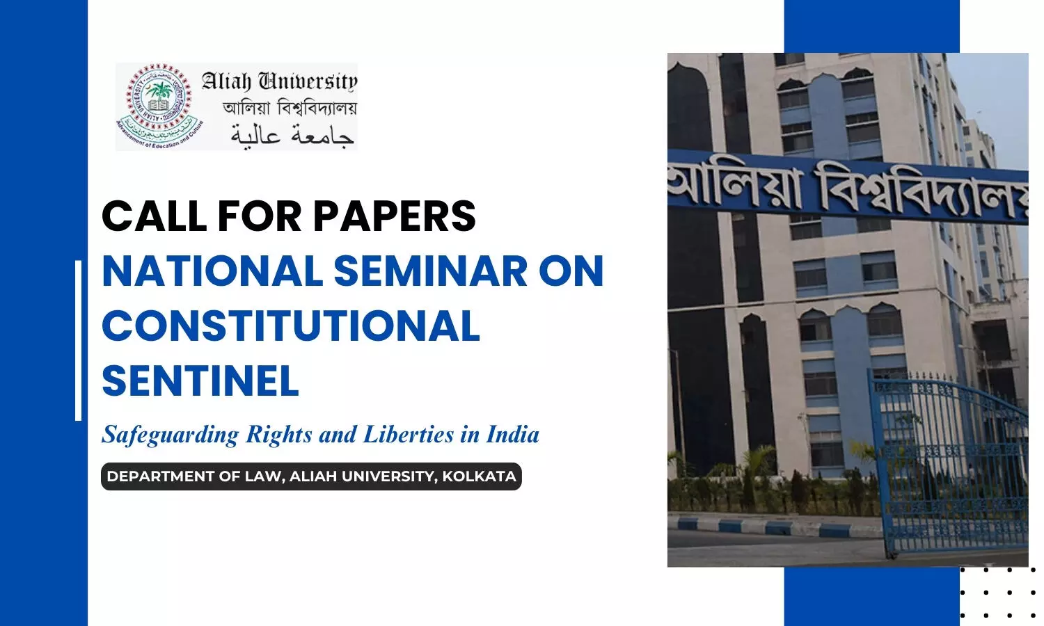 Department of Law, Aliah University is inviting submissions for the One-Day National Seminar on Constitutional Sentinel: Safeguarding Rights and Liberties in India.