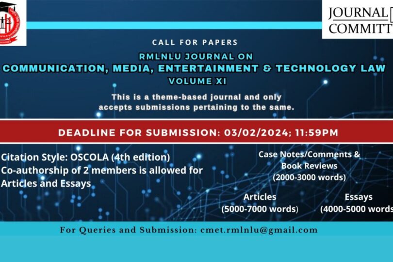 RMLNLU Journal on Communication, Media, Entertainment & Technology Law is inviting submissions for its upcoming Volume 11.