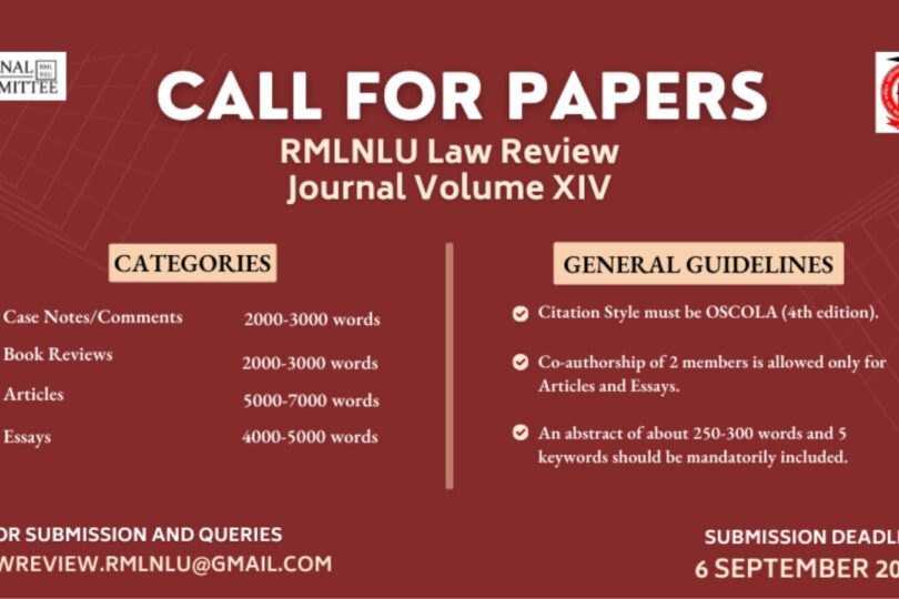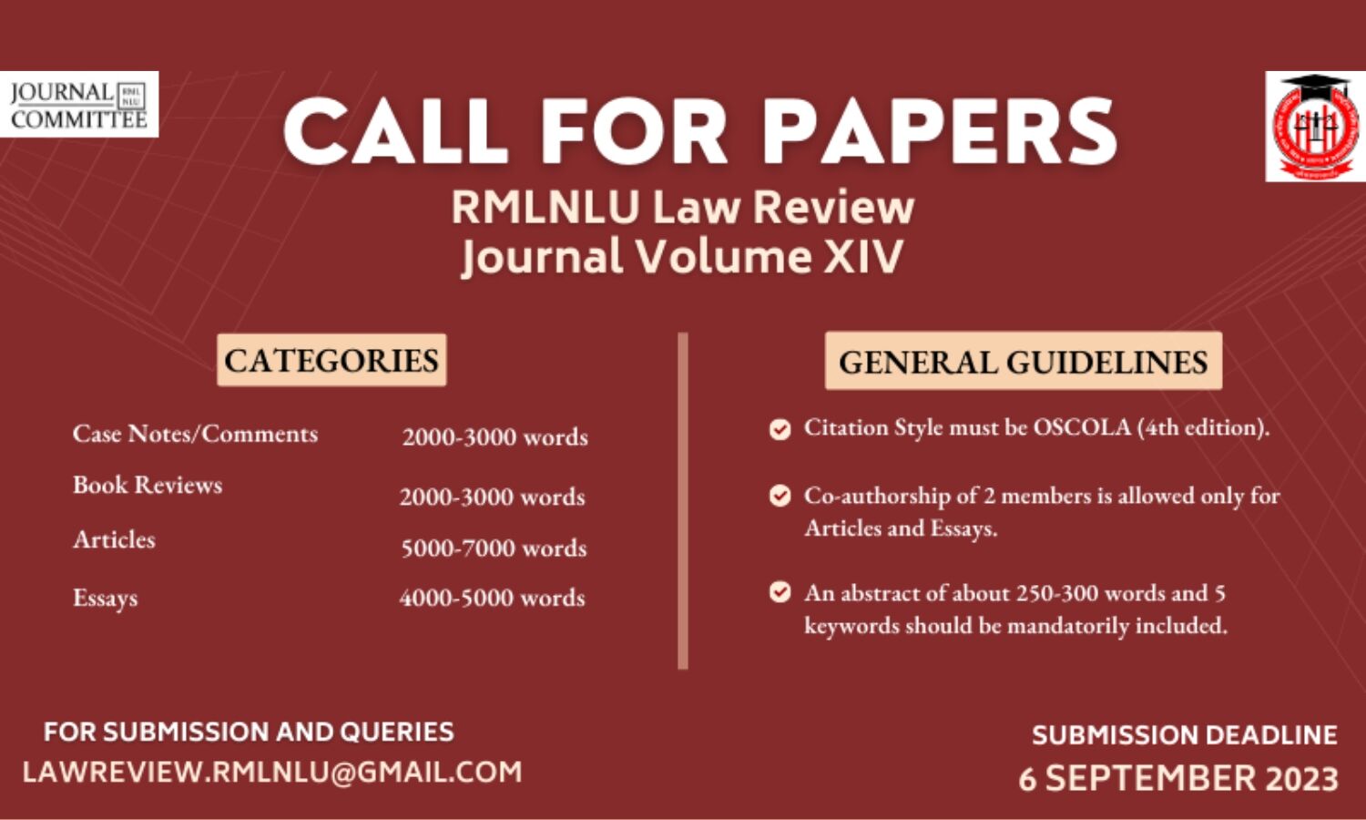 RMLNLU Law Review Journal is inviting submissions for its XIV Volume to be submitted by September 6, 2023. The Journal accepts submissions from law students and professionals all over the country and abroad.