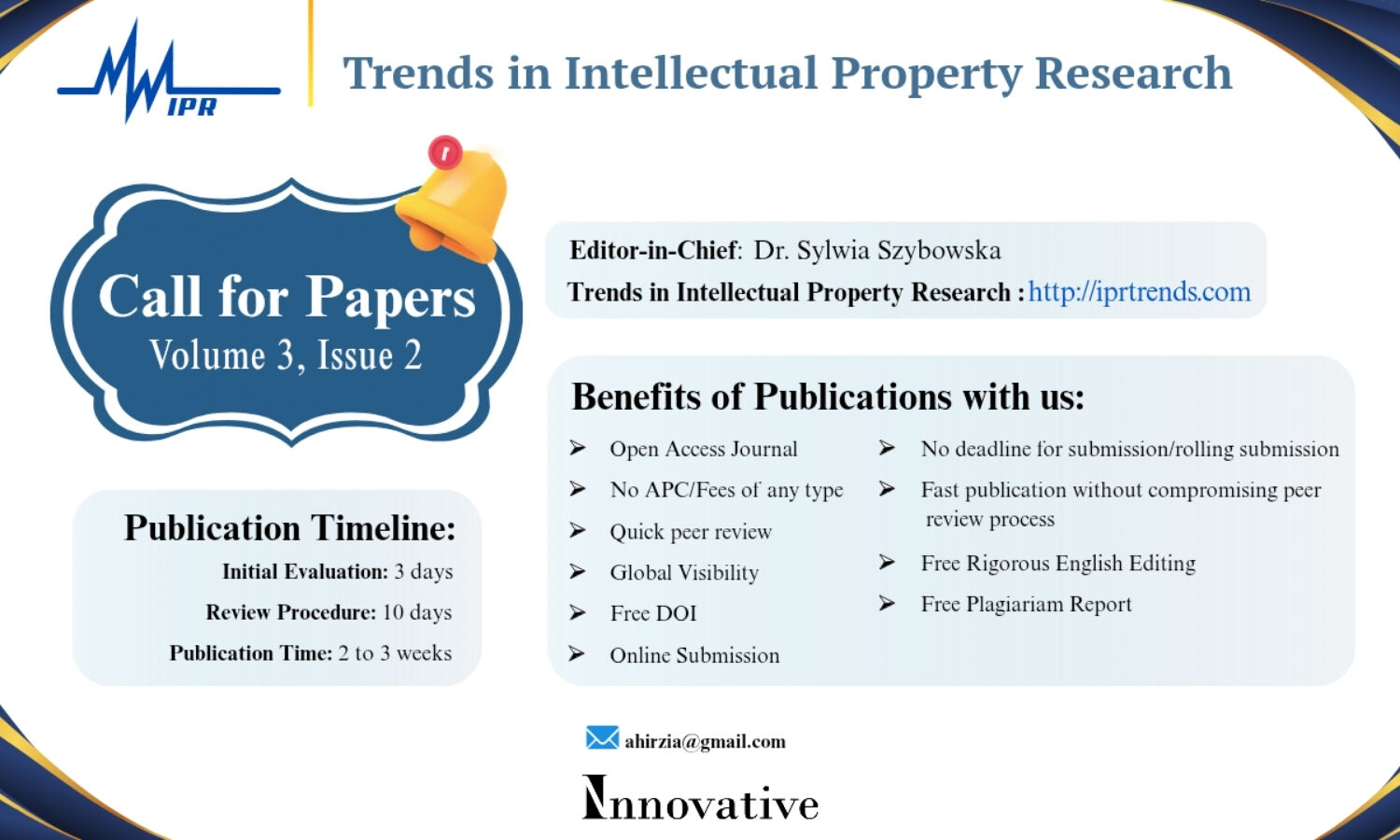 Trends in Intellectual Property Research (DOI: 69971; ISSN: 3007-8539 (Online), 3007-8520 (Print) is the flagship journal of the Innovative Publishing group. Trends in Intellectual Property Research publishes research papers, review papers, case comments and books reviews related to all aspects of intellectual property law, including but not limited to patents, copyrights, trademarks, trade secrets, industrial design, layout design of integrated circuit, unfair competition, and antitrust.