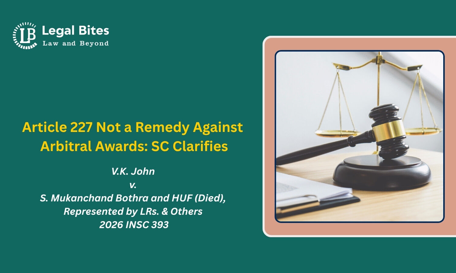 The Supreme Court of India, in its recent judgment in V.K. John v. S. Mukanchand Bothra and HUF (Died), represented by LRs. & Others (2026 INSC 393), clarified that a challenge to an arbitral award by legal representatives must be pursued under Section 34 of the Arbitration and Conciliation Act, 1996. The Court made it clear that invoking Article 227 of the Constitution for such challenges is not permissible when a specific statutory remedy exists.