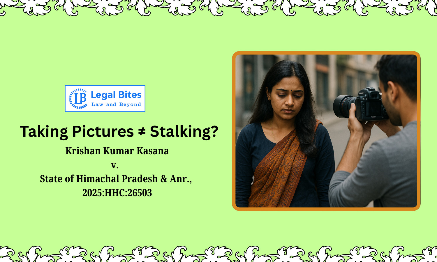 The Himachal Pradesh High Court in Krishan Kumar Kasana v. State of H.P. has provided important clarity on the scope of Section 78 of the Bharatiya Nyaya Sanhita, 2023. It held that taking pictures alone, without repeated pursuit or intent to foster interaction, does not amount to stalking.