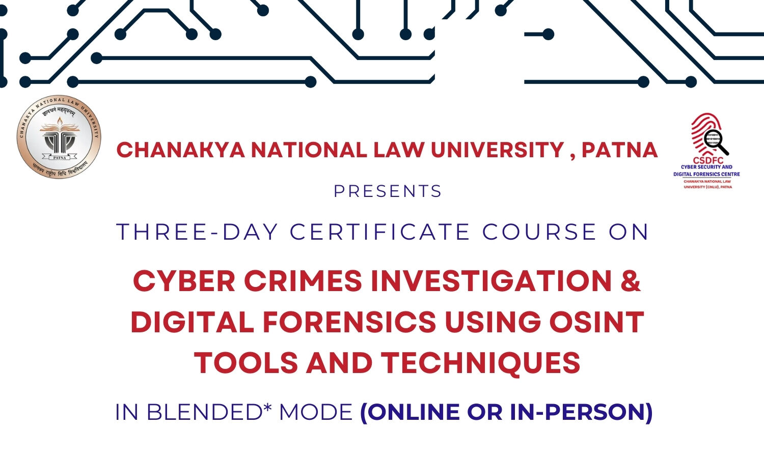 - In-person Venue: Cyber Forensics Lab, Cyber Security and Digital Forensics Centre (CSDFC), CNLU Campus, Patna