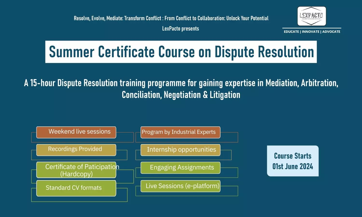 LexPacto is organising a 5-Weeks Certificate Course on Dispute Resolution from 1st June 2024 to 30th June 2024.