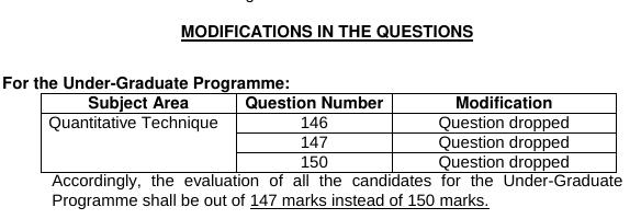 - dropping 3 questions and changing the answer keys to another 4 questions in the undergraduate exam (one each in the English and Current Affairs sections and two in Quantitative Techniques); in the postgraduate test, 1 question was dropped.
