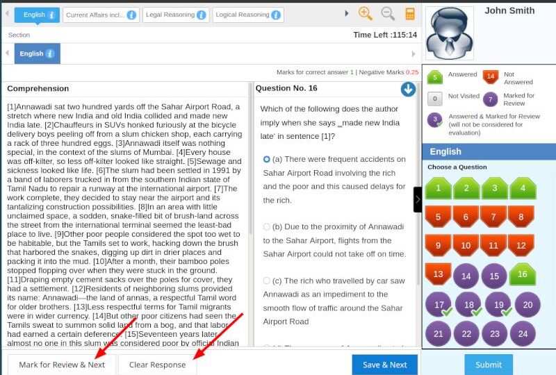 The two arrows point to two parts of the interface that may have tripped up candidates (screenshot from the CLAT mock exam)