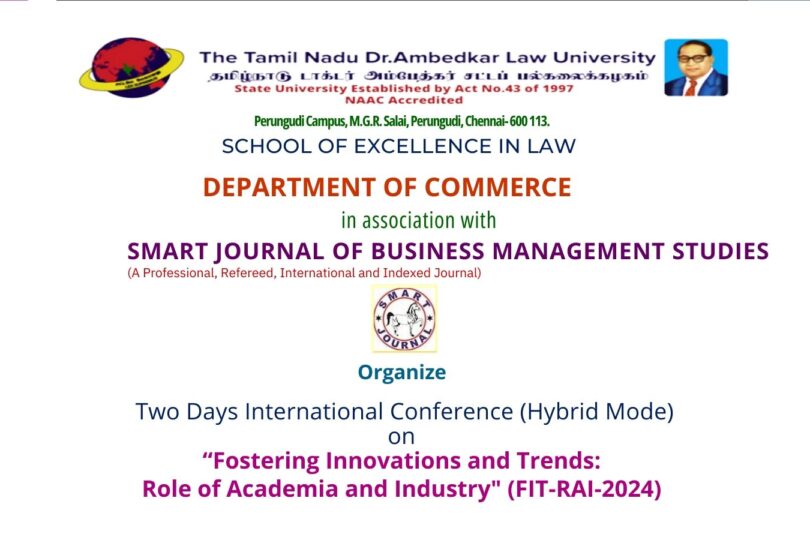 School of Excellence in Law, TNDALU is organising a Two-Day International Conference on Fostering Innovations and Trends: Role of Academia and Industry on 9th and 10th January 2024 in Hybrid Mode.