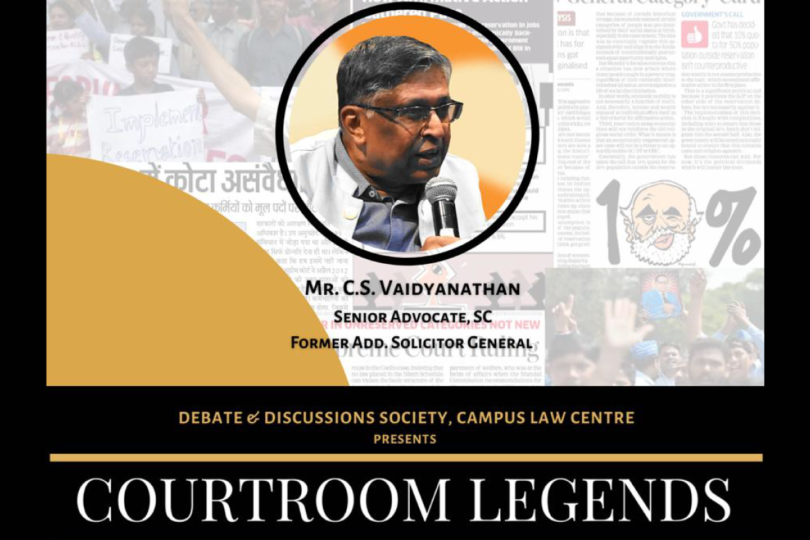 Debate & Discussions Society, CLC, DU is organising the Keynote Series “COURTROOM LEGENDS Episode 2” on the topic “Equal Opportunity and Meritocracy”. Former Additional Solicitor General of India, Sr. Advocate Shri. C. S. Vaidyanathan will be delivering a Keynote in the session.