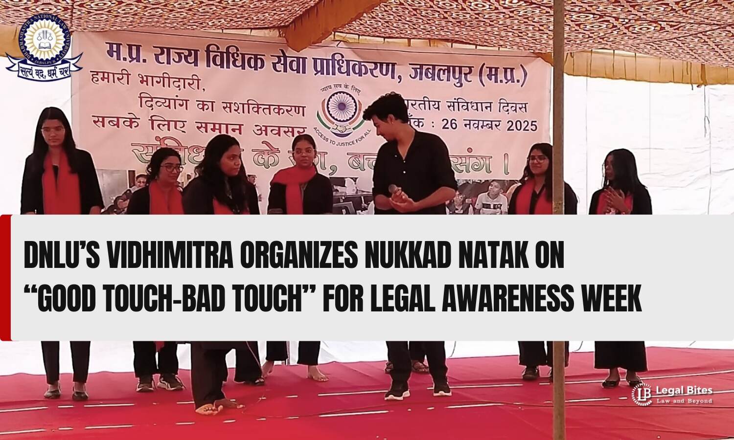 Dharmashastra National Law University (DNLU), Jabalpur, marked Legal Awareness Week with an impactful initiative aimed at promoting child safety and legal consciousness. Vidhimitra – The Legal Aid Cell of DNLU – conducted a Nukkad Natak (street play) on the theme “Good Touch – Bad Touch” on 26 November 2025 at Drishti Badhit School, Jabalpur Bypass Road, Dhanvantri Nagar. The event was organized in collaboration with the Madhya Pradesh State Legal Services Authority and the District Legal Services Authority.