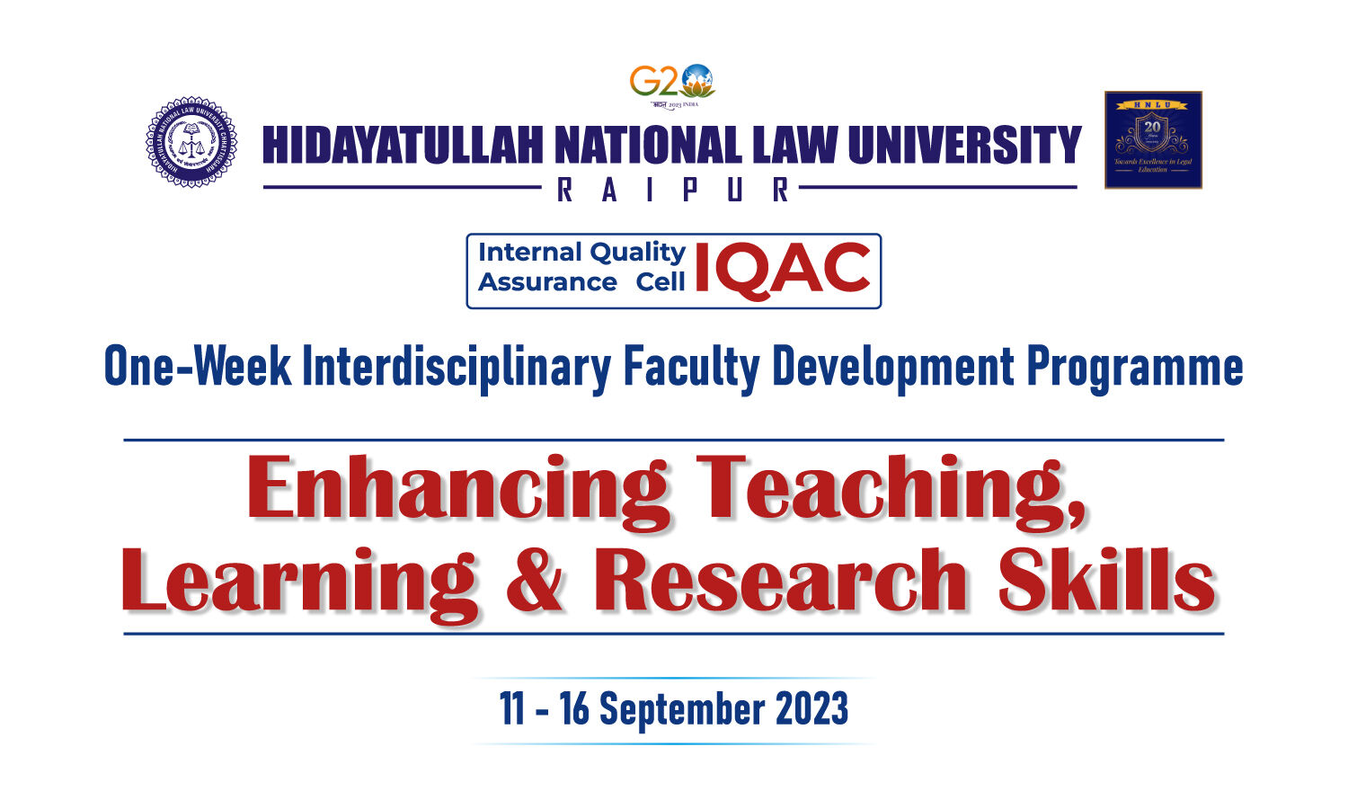 The Internal Quality Assurance Cell of HNLU will be conducting a one-week Interdisciplinary Faculty Development Programme on “Teaching, Learning and Research Skills’ from 11th to 16th September 2023 on Online Mode (05.00 PM – 07.45 PM). on all days).