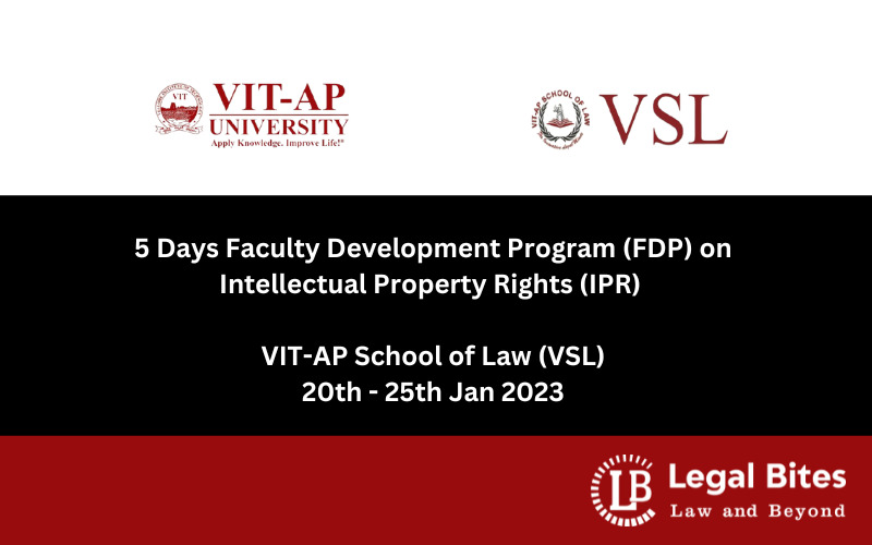 VIT-AP School of Law (VSL) of VIT-AP University at Andhra Pradesh is organizing a Five Day Faculty Development Program to refresh and reorient the stakeholders on Critical issues of IPR. The FDP will feature interactive thematic sessions, workshops and informative presentations. Speakers and attendees will include leading academicians, counsels and experts from the field of Intellectual Property in India and from overseas.