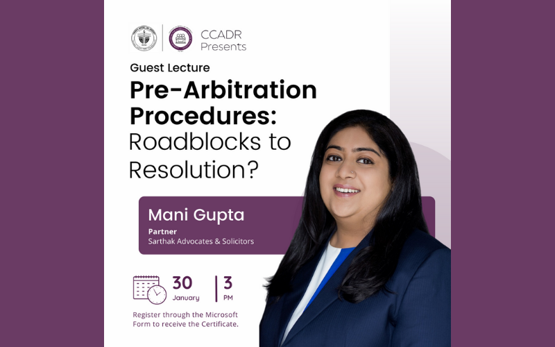 The CCADR, CNLU is organising a guest lecture on Pre Arbitration Procedures: Roadblock to Resolution? by Mani Gupta on 30th January 2022.