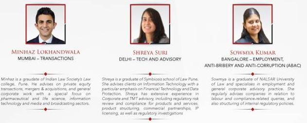 - Sowmya Kumar (Bangalore, employment, anti-bribery and anti-corruption; Nalsar Hyderabad).