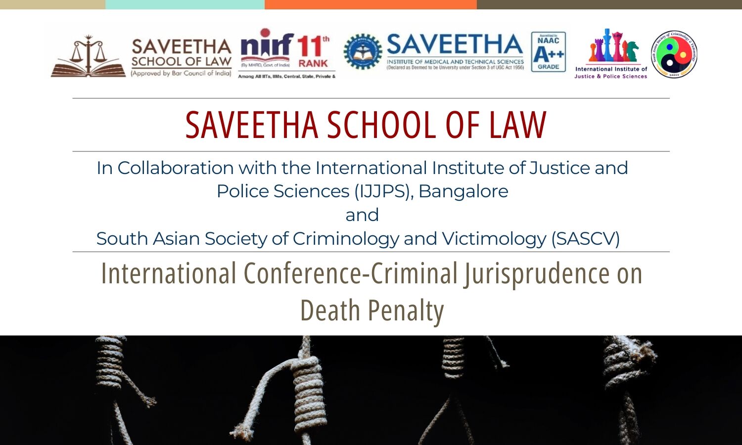 Saveetha School of Law is organising the International Conference on Criminal Jurisprudence on Death Penalty in collaboration with the International Institute of Justice and Police Sciences (IJJPS), Bangalore, and the South Asian Society of Criminology and Victimology (SASCV) on September 15th and 16th, 2023.