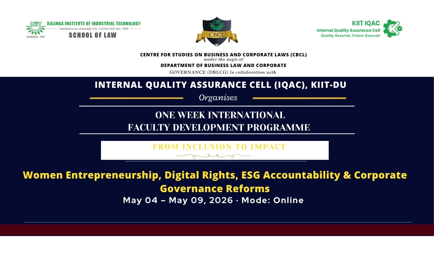 KIIT School of Law, KIIT Deemed to be University (KIIT-DU), Bhubaneswar, Odisha is organizing One Week International Faculty Development Programme (Online) titled “From Inclusion to Impact: Women Entrepreneurship, Digital Rights, ESG Accountability & Corporate Governance Reforms.