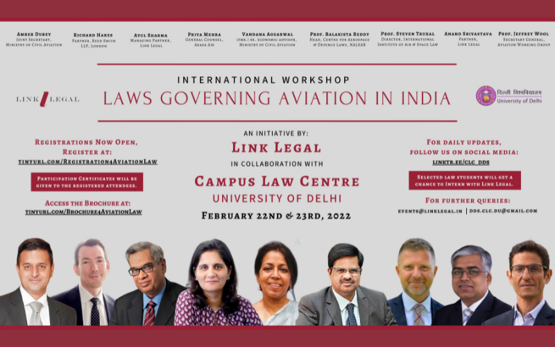 International Workshop on Laws Governing Aviation in India is being organised by CLC, University of Delhi and Link Legal on 22nd & 23rd February 2022.
