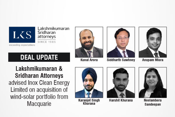 Lakshmikumaran & Sridharan Attorneys advised Inox Clean Energy Limited on acquisition of wind-solar portfolio from Macquarie
