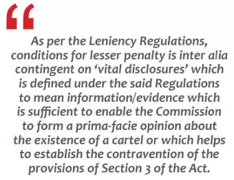 It is noteworthy that as per the Leniency Regulations, conditions for lesser penalty is inter alia contingent on ‘vital disclosures’ which is defined under the said Regulations to mean information/evidence which is sufficient to enable the Commission to form a prima-facie opinion about the existence of a cartel or which helps to establish the contravention of the provisions of Section 3 of the Act. What should be kept in mind is that the leniency provision prescribed under the Act read with the Regulations is what former CCI Chairperson D.K. Sikri describes as “fantastic” for enforcement actions against cartels. Even in countries where Antitrust laws are more developed compared to India, leniency regimes are the foremost tool for cartel detection. As is evident from all the leniency orders passed by the CCI, the disclosures made by the applicants are enabling it to recognize and penalize anti-competitive forces like cartels in the market. With every passing order, the market players are becoming increasingly aware of the benefits of the leniency regime which works on the touchstone of incentivization. Thus, for the incentive to be evident to an applicant, such that he comes forward to make disclosures, it is imperative that the CCI makes its incentivization approach clear and uniform.