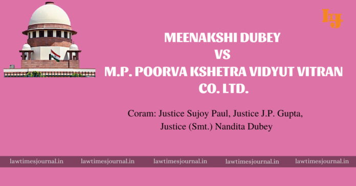 In the court of the High Court of Madhya Pradesh Criminal Appeal No. 64 of 19771979 AIR 185, 1979 SCR (1) 810 Petitioner Meenakshi Dubey Respondent M.P. Poorva Kshetra Vidyut Vitran Co. Ltd. Date of Judgement 2nd March 2020 Bench Hon’ble Justice Sujoy Paul; Justice J.P. Gupta; Justice (Smt.) Nandita Dubey