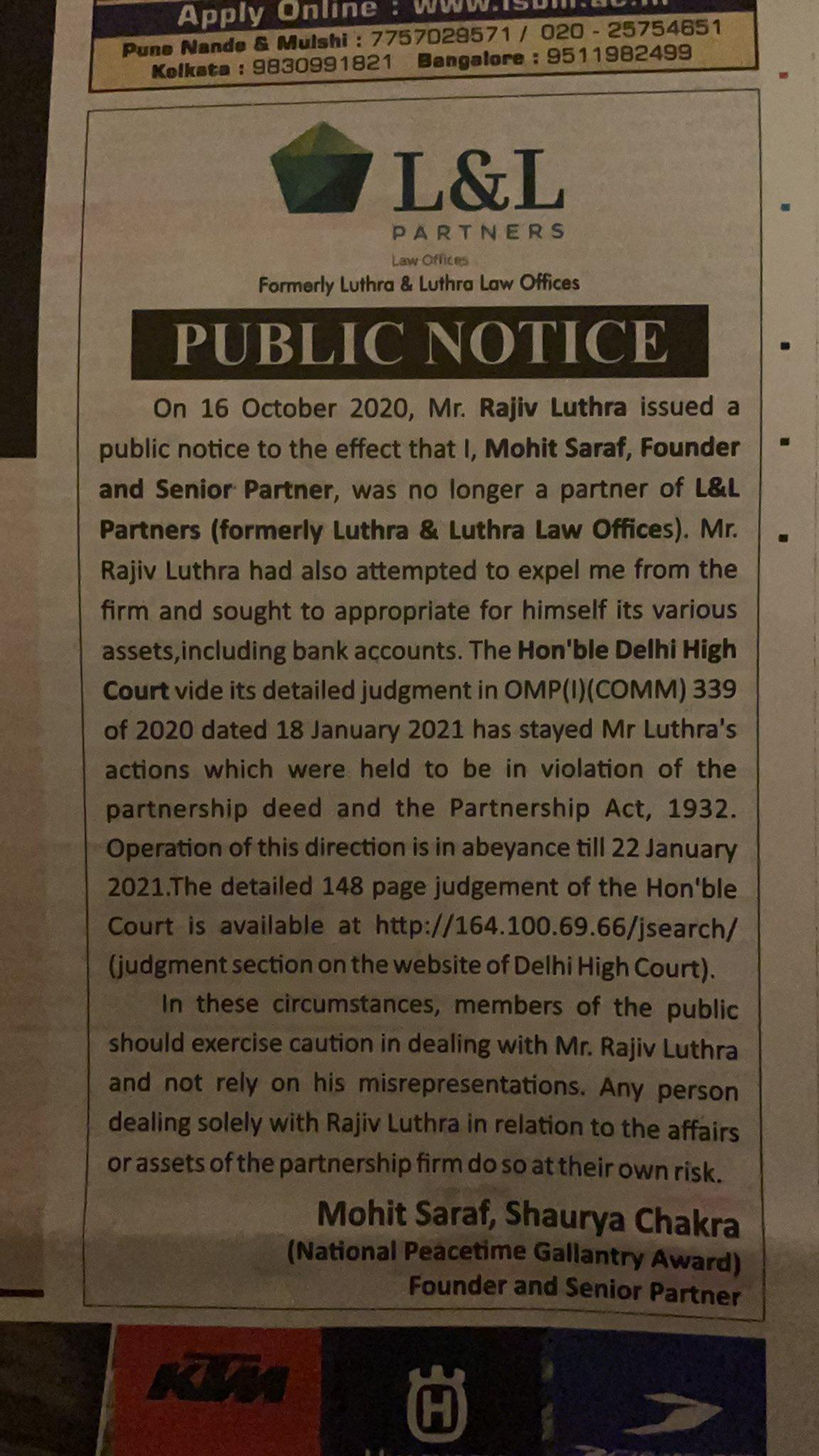 On 16 October 2020, Mr. Rajiv Luthra issued a public notice to the effect that I, Mohit Saraf, Founder and Senior Partner, was no longer a partner of L&L Partners (formerly Luthra & Luthra Law Offices).