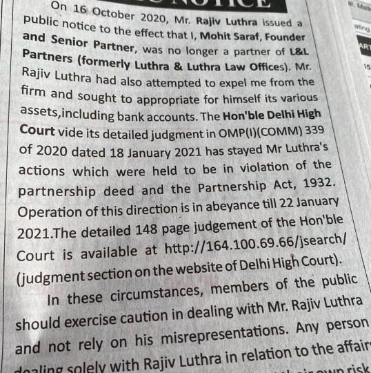 Following his victory on Monday in the Delhi high court, co-founding partner and de facto reinstated senior partner of L&L Partners, Mohit Saraf, has responded in kind to his co-founder Rajiv Luthra with a newspaper notice that of the favourable judgment and warning the public that the public should “exercise caution in dealing with Mr. Rajiv Luthra”.