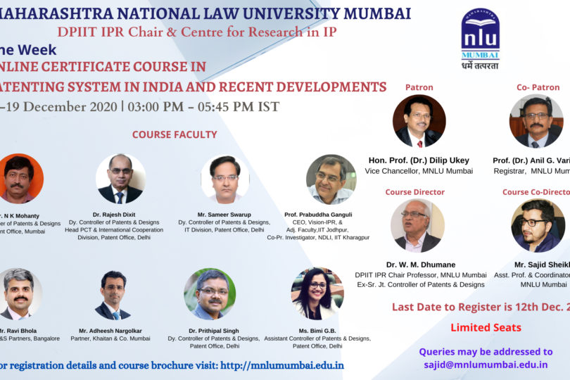 MNLU Mumbai One Week Certificate Course in Patenting System in India | 14 – 19 Dec. 2020