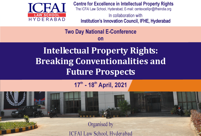 Center of Excellence in Intellectual Property Rights, ICFAI Law School, Hyderabad in collaboration with Institution’s Innovation Council, IFHE, Hyderabad is organizing a Two-day National E-Conference on “Intellectual Property Rights: Breaking Conventionalities and Future Prospects”. The conference will be conducted on 17th and 18th April 2021.