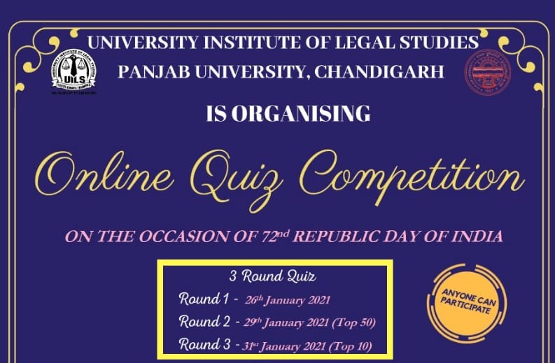 UILS, Panjab University, Chandigarh is organizing a Three-Round National Quiz Competition to celebrate “Republic Day” on January 26, 2021, under the guidance of Prof. (Dr.) Raj Kumar (Chief Patron), Vice-Chancellor, Panjab University, Chandigarh; Prof. (Dr.) Rajinder Kaur, Director, University Institute of Legal Studies, Panjab University, Chandigarh; Dr. Pushpinder Kaur, Associate Professor (Law), University Institute of Legal Studies, Panjab University, Chandigarh.