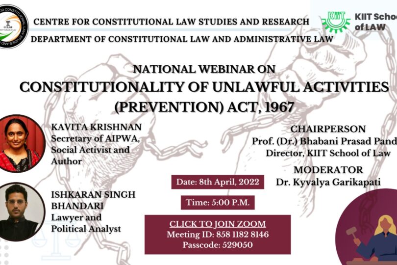 An online webinar on the topic “Constitutionality of Unlawful Activities (Prevention) Act,1967”, is being organized by KIIT Centre for Constitutional Law Studies & Research (CCLSR) and Department of Constitutional Law & Administrative Law, Kalinga Institute of Industrial Technology (KIIT) School of Law, on April 8 2022 (Friday).