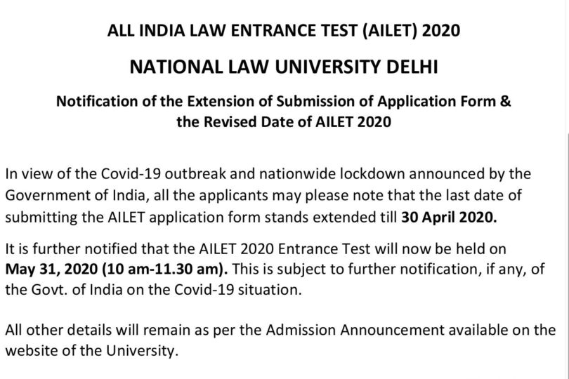 NLU Delhi’s admissions exam, the All India Law Entrance Test (AILET) 2020, has been postponed to 31 May (10am to 11:30am), following suit of the Common Law Admission Test (CLAT), which we had first reported yesterday to have postponed its exam to 24 May.
