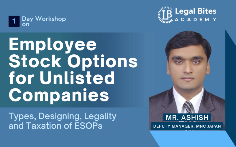 Legal Bites Academy is delighted to announce that we are organizing a 1 day Online Workshop on Employee Stock Options for Unlisted Companies. This workshop has been designed for all law students and budding lawyers who want to understand the designing and legal documentation for Employee Stock Options. This workshop provides the knowledge and skills necessary to understand the designing, legality and taxation on employee stock options. The workshop shall be conducted live in online mode on 25th September 2021 from 02:30 PM to 05:30 PM.