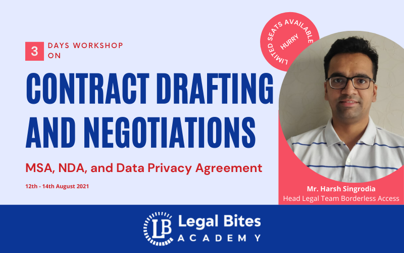 Legal Bites Academy is delighted to announce that we are organizing a 3 Days Online Workshop on Contract Drafting and Negotiations (MSA, NDA, and Data Privacy Agreement). This workshop has been designed for all law students and budding lawyers who want to build their careers in Contract Drafting and Negotiations. This workshop provides the knowledge and skills necessary to become excellent in Contract Drafting and Negotiations, with solid legal foundations and a broader vision of the sector. The workshop shall be conducted live in online mode from 12th August 2021 to 14th August 2021.