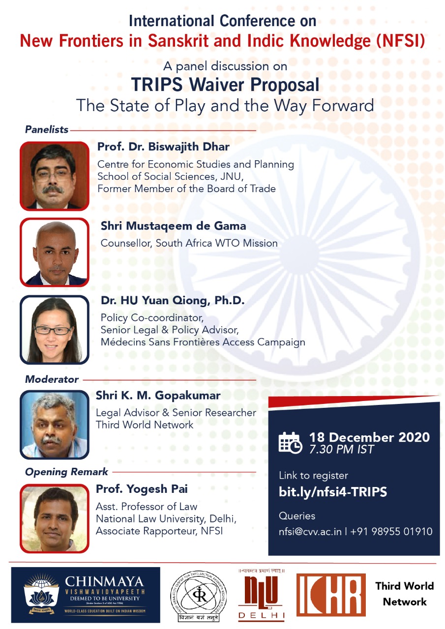 Access to medicines and medical technologies has been a recurring concern across the globe, particularly in times of a pandemic. While Intellectual Property protection provides incentives to enable new research, it is also a major reason for inaccessibility of such technologies due to the existence of the global IP regime enforced through the TRIPS Agreement and/or various other international agreements. In response to the current COVID19 crisis, India along with South Africa, Kenya and Estwani approached the TRIPS council to waive obligations regarding the protection and enforcement of certain IP rights to enable the fight against the pandemic. While many developed countries expressed their scepticism on the proposal, it obtained wide support from WTO member countries, international organizations like WHO and UNAIDS, academia and social movements. Further deliberation on the proposal is going to take place in the TRIPS Council and General Counsel of WTO. Against this background, under the aegis of the 4th International Conference on ‘New Frontiers in Sanskrit and Indic Knowledge’, Chinmaya Viswavidyapeeth, along with NLUD, IUCIPRS-CUSAT & TWN is organizing a panel discussion to understand the imperativeness of the waiver proposal.