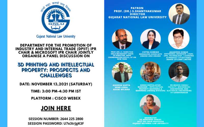 Panel Discussion on 3D Printing and Intellectual Property: Prospects and Challenges | GNLU | 13th November 2021