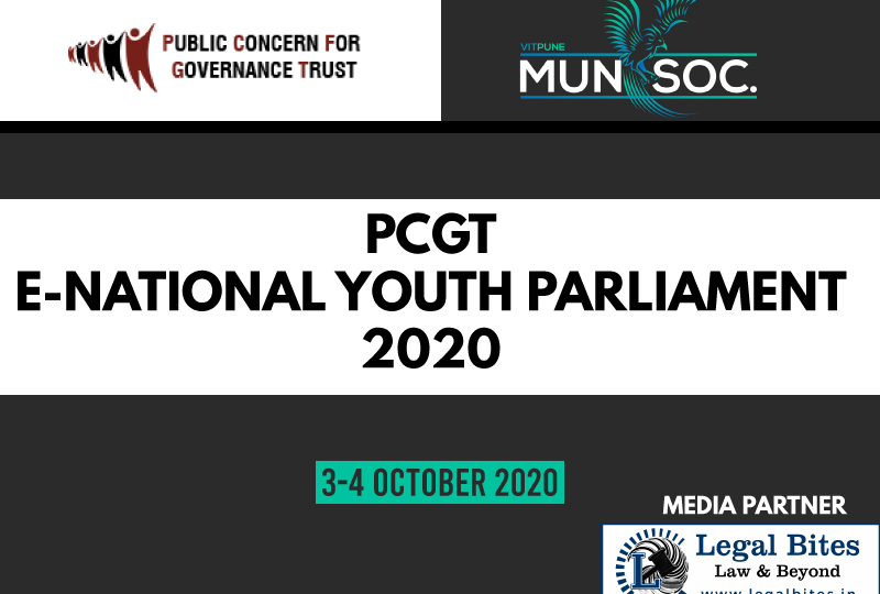 Public Concern for Governance Trust (PCGT) in association with VIT Pune MUN Society presents PCGT e-National Youth Parliament, Pune, which will be held on 3rd and 4th October 2020 through Zoom as the online platform.